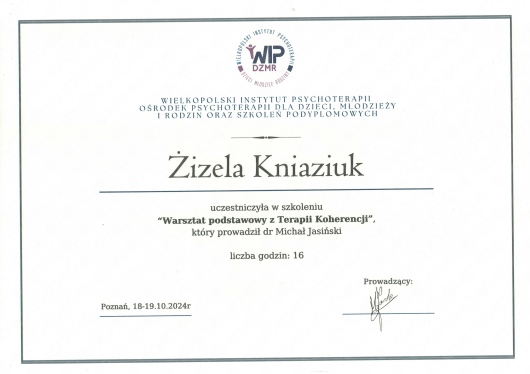 - "Warsztat podstawowy z Terapii Koherencji (16 h), Michał Jasiński, Wielkopolski Instytut Psychoterapii, 2024 r.