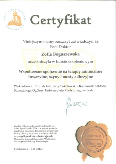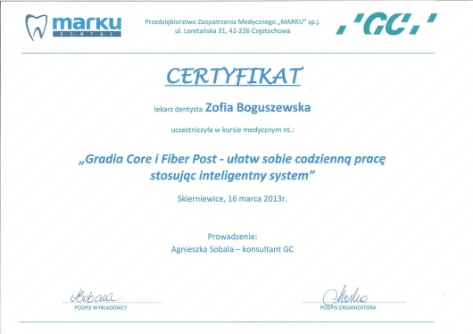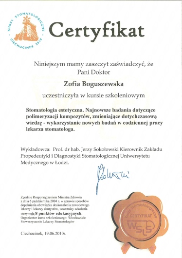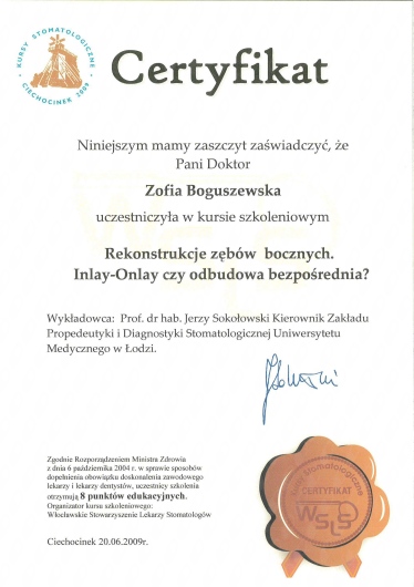 Jaki jest zakres porad oferowanych przez Zofia Boguszewska?Zofia Boguszewska to stomatolog. Na podstawie swojego doświadczenia i wykształcenia Zofia Boguszewska oferuje usługi takie jak: konsultacja protetyczna, Konsultacja stomatologiczna, pakiet higienizacyjny, konsultacja stomatologiczna osoby dorosłej.