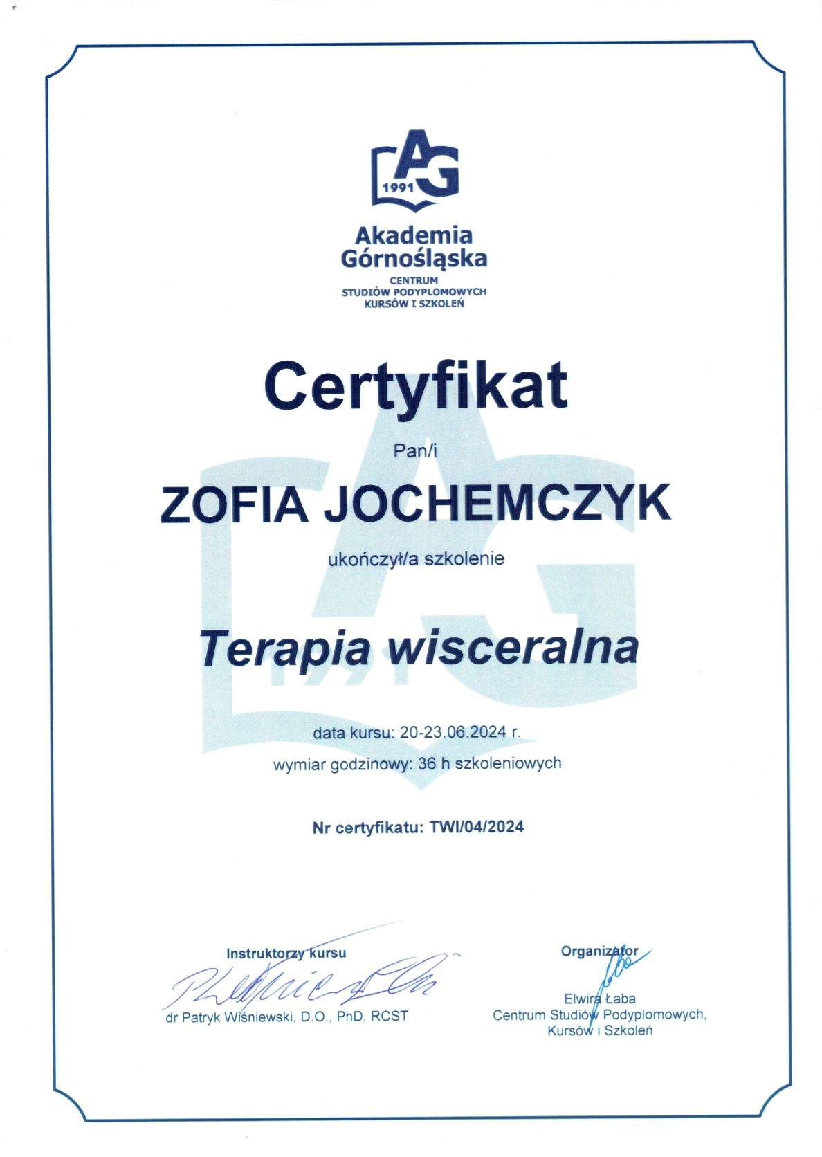 Obecnie specjalizuję się przede wszystkim w terapii mięśniowo-powięziowej, wykorzystując masaż tkanek głębokich oraz terapię narzędziową. Moim celem jest skuteczna, świadoma i bezpieczna praca z pacjentem, która realnie poprawia komfort codziennego funkcjonowania.