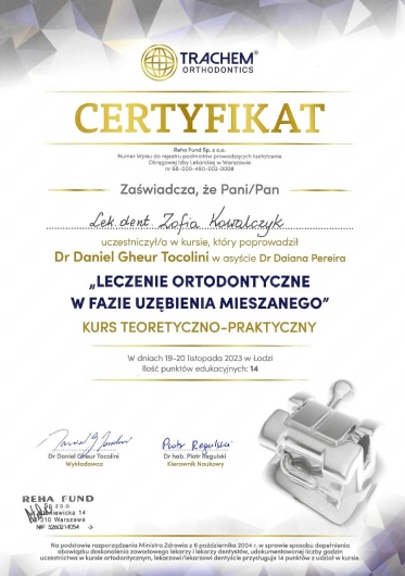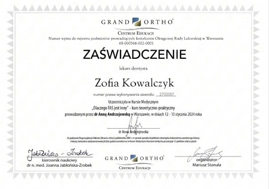 Jaki jest zakres porad oferowanych przez Zofia Kowalczyk?Zofia Kowalczyk to stomatolog. Na podstawie swojego doświadczenia i wykształcenia Zofia Kowalczyk oferuje usługi takie jak: Konsultacja lekarska, konsultacja ortodontyczna.