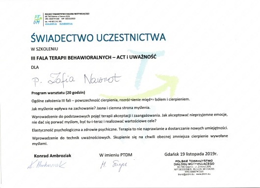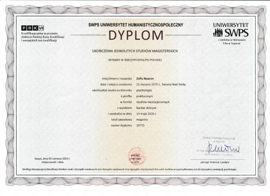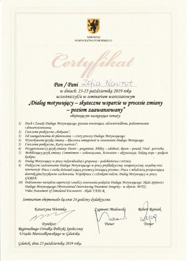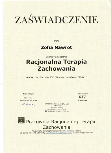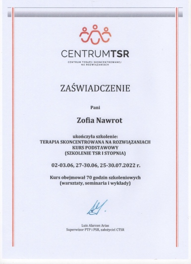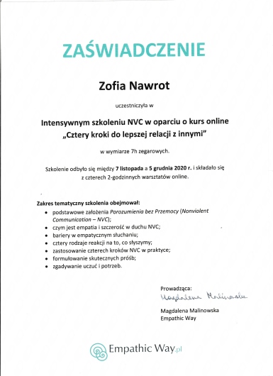 Osoba życzliwa, tworzy dobrą atmosferę sprzyjającą rozmowie, otwarciu się. Słucha ze szczególną uwagą. Spotkania wyjątkowo ciepłe i nacechowane przyjaźnią oraz wyraźną chęcią pomocy. Widoczny profesjonalizm. Pani Zofia jest osobą ze wszech miar godna polecenia.