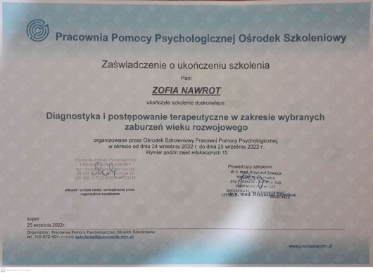 Wizyta u Pani Zofi przebiegała w miłej i komfortowej atmosferze sprzyjającej rozmowie o problemie z którym przyszłam. Pełen profesjonalizm duża wiedzą. Poczułam.sie zaopiekowana i wysłuchana. Podchodzi indywidualnie do pacjenta. A porady które wysłuchałam korzystnie wpłynęły na moje samopoczucie. Polecam bardzo serdecznie