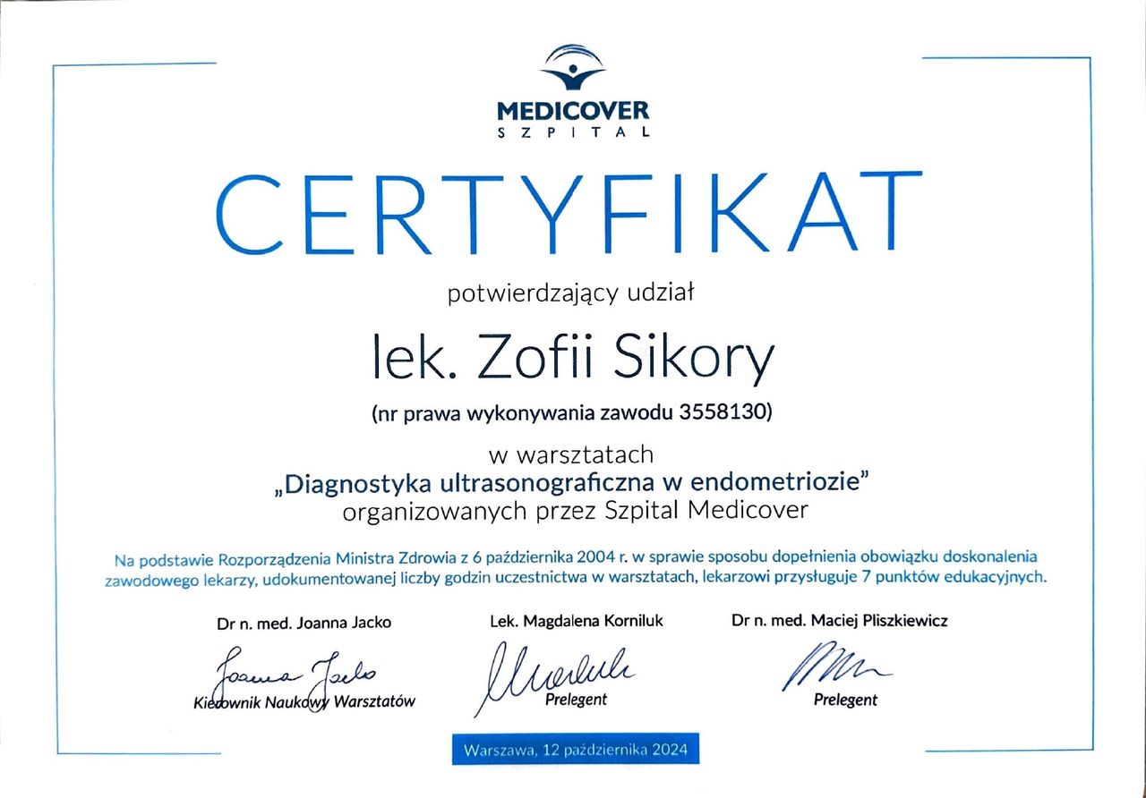 Jaki jest zakres porad oferowanych przez Zofia Sikora?Zofia Sikora to w trakcie specjalizacji (ginekolog). Na podstawie swojego doświadczenia i wykształcenia Zofia Sikora oferuje usługi takie jak: konsultacja ginekologiczna + USG, konsultacja położnicza + USG, Porada antykoncepcyjna + USG, Wizyta poporodowa, Monitoring owulacji -pierwsza wizyta w cyklu, Monitoring cyklu -kolejna wizyta w cyklu, konsultacja ginekologiczna z wynikami badań, Konsultacja poporodowa, założenie implantu antykoncepcyjnego, konsultacja online mailowa.