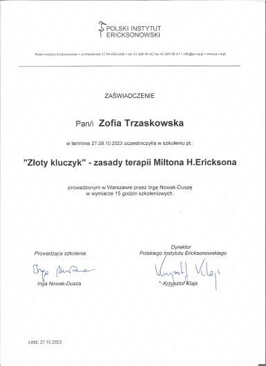 Pracuję z osobami dorosłymi, łącząc różne skuteczne metody. Ukończyłam 5-letnie psychologiczne studia magisterskie ze specjalizacją psychoseksuologiczną na Uniwersytecie Gdańskim. Obecnie jestem w trakcie szkoły psychoterapii w nurcie ericksonowskim w Polskim Instytucie Ericksonowskim, korzystam też z metod TSR, których nauczyłam się na pierwszym stopniu Centrum Terapii Skoncentrowanej na Rozwiązaniach, jak również z wiedzy zdobytej podczas certyfikujących szkoleń z terapii par i interwencji kryzysowej w Psychologicznym Centrum Rozwoju w Lublinie.