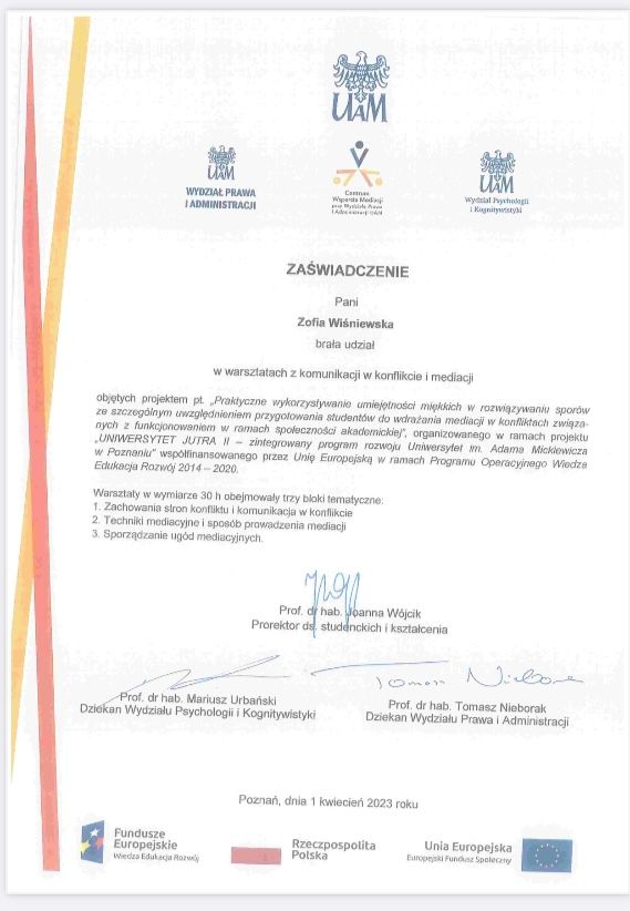 Nazywam się Zofia Wiśniewska i jestem dyplomowanym psychologiem. Ukończyłam pięcioletnie jednolite studia magisterskie na uniwersytecie im. Adama Mickiewicza w Poznaniu ze specjalnością seksuologia kliniczna oraz psychologia kliniczna. Jestem również psychoterapeutą w trakcie szkolenia w nurcie psychodynamicznym. Swoje umiejętności oraz wiedzę poszerzam w Krakowskim Centrum Psychodynamicznym. Ukończyłam studia podyplomowe z zakresu psychologii uzależnień na uniwersytecie SWPS w Poznaniu. Na codzień zajmuję się konsultacjami psychologicznymi, interwencją kryzysową, poradnictwem z zakresu uzależnień oraz wsparciem psychologicznym. W swojej pracy stawiam na ciągły rozwój i nieustannie się szkolę - ukończyłam kursy „Komunikacja w konflikcie i mediacji”, „Spektrum autyzmu w perspektywie neuroróżnorodności”. Doświadczenie zawodowe zdobywałam na ponad rocznych rocznych praktykach w Oddziale Zewnętrznym w Koziegłowach Aresztu Śledczego w Poznaniu oraz Ośrodku Diagnostycznym w Areszcie Śledczym w Poznaniu. Odbyłam również praktyki zawodowe w Wojewódzkim Szpitalu dla Psychicznie i Nerwowo Chorych „Dziekanka”. Miałam także okazję uczyć się od psychoterapeutów psychodynamicznych z Psychologiczno - seksuologicznego Ośrodka Rozwoju i Terapii PORT w Poznaniu.