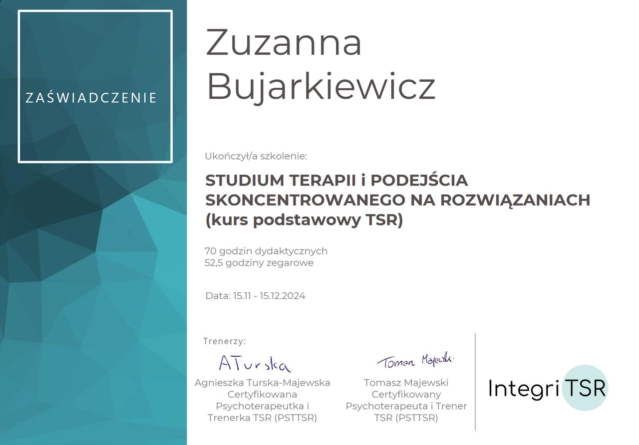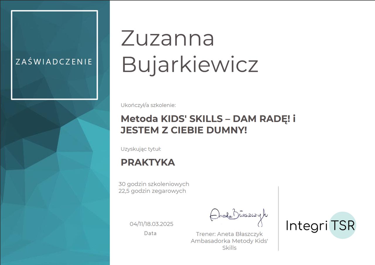 Regularnie podnoszę swoje kwalifikacje zawodowe, uczestnicząc w licznych kursach i szkoleniach. Dodatkowo swoją pracę systematycznie poddaję superwizji, aby zapewnić jak najwyższą jakość świadczonych usług i skuteczność podejmowanych interwencji terapeutycznych.