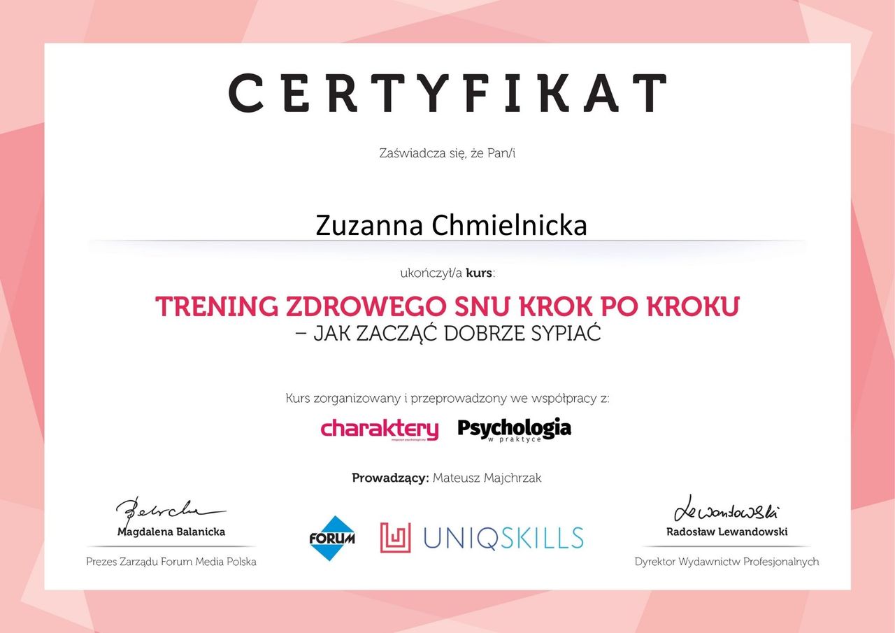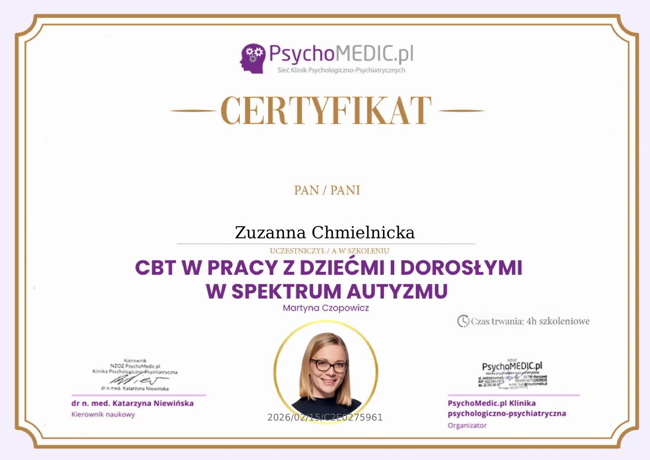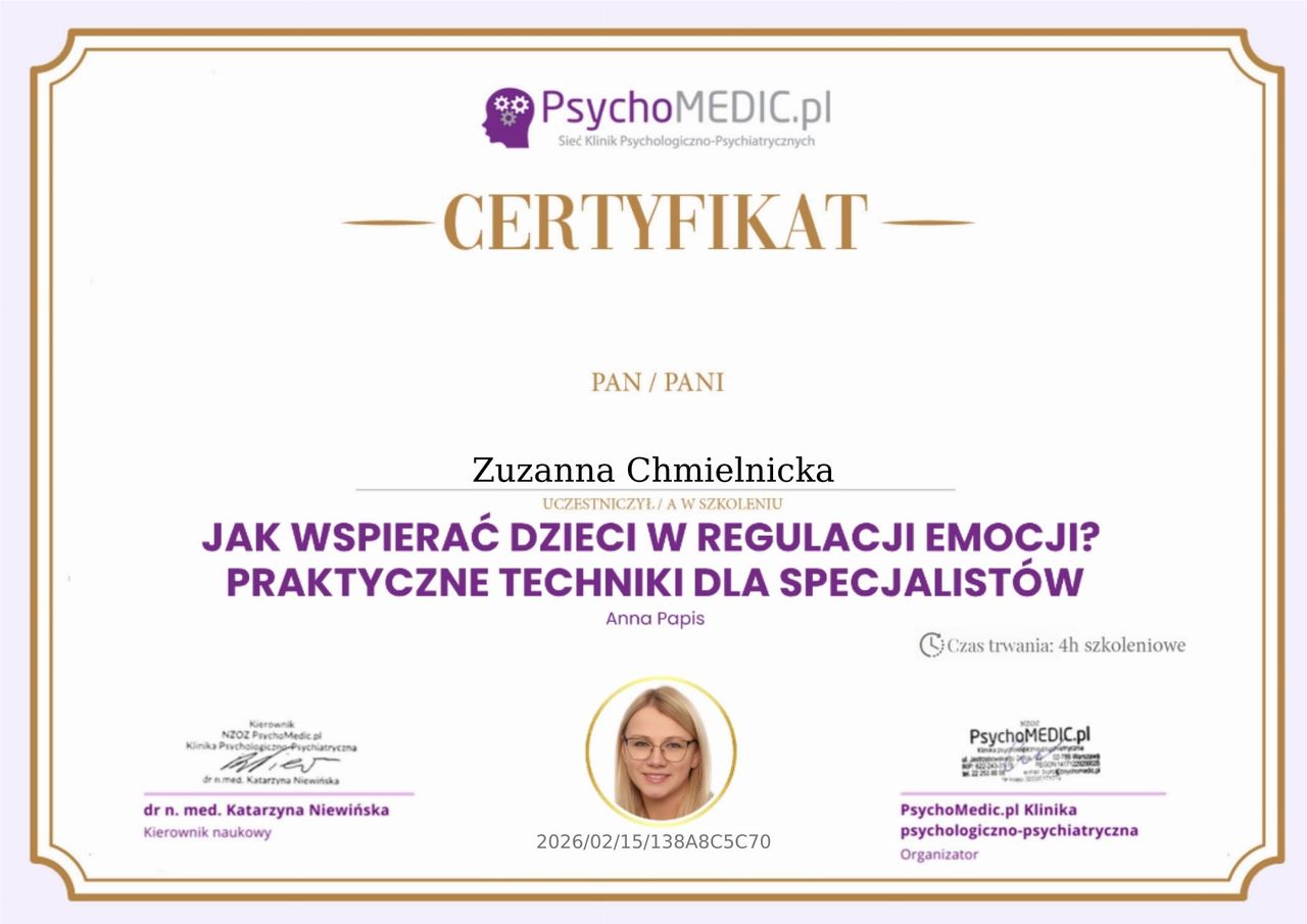 Ukończyłam specjalistyczny program diagnostyczno-terapeutyczny z zakresu psychologii dziecięcej w PsychoMedic.