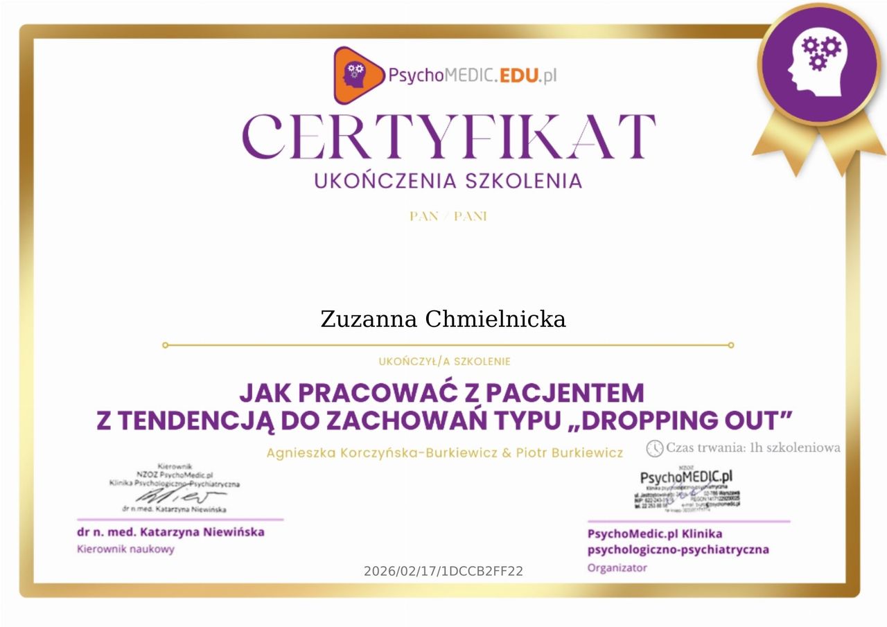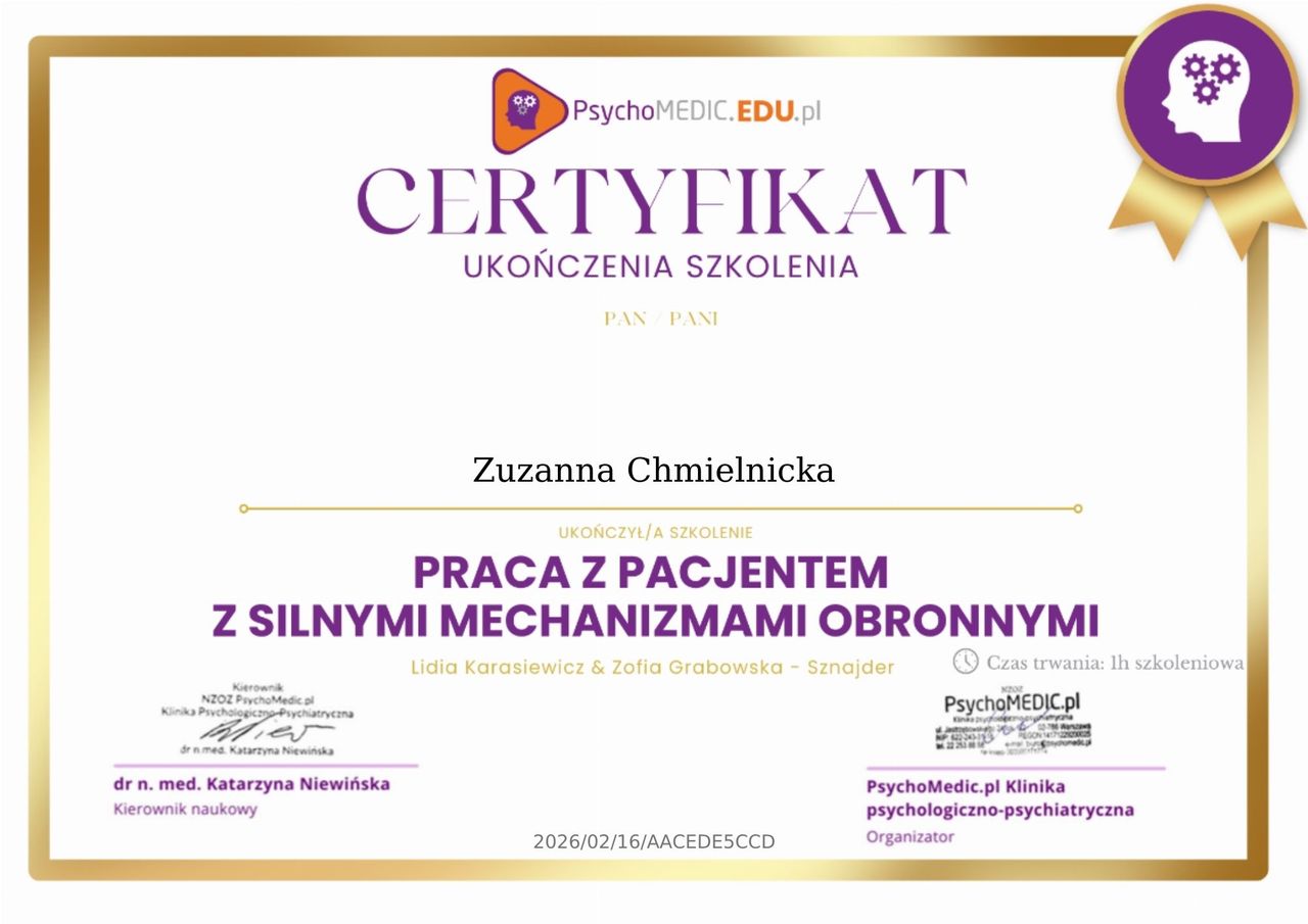 Regularnie rozwijam swoje kompetencje, uczestnicząc w szkoleniach i kursach psychologicznych.