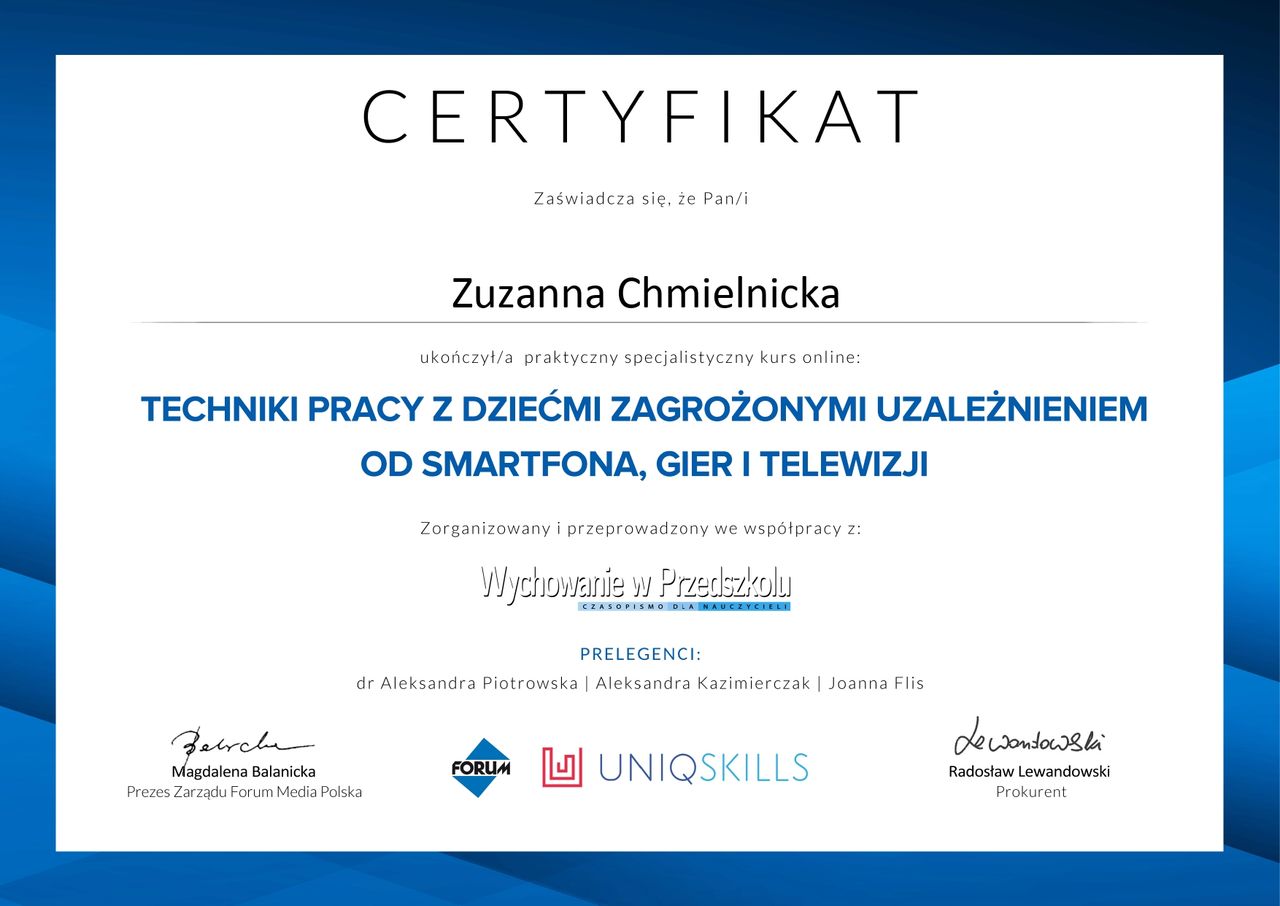 Czy Zuzanna Chmielnicka przyjmuje online, bez konieczności pojawiania się w placówce?Nie, w tym momencie Zuzanna Chmielnicka nie oferuje konsultacji online.
