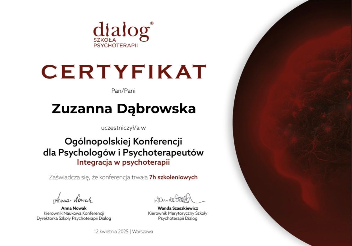 Swoją pracę regularnie superwizuję. Nieustannie się szkolę i poszerzam swoją wiedzę, aby pracować zgodnie z aktualnymi standardami w psychologii. Przestrzegam zasad etyki zawodowej – dbam o poufność, bezpieczeństwo i profesjonalizm w relacji terapeutycznej.