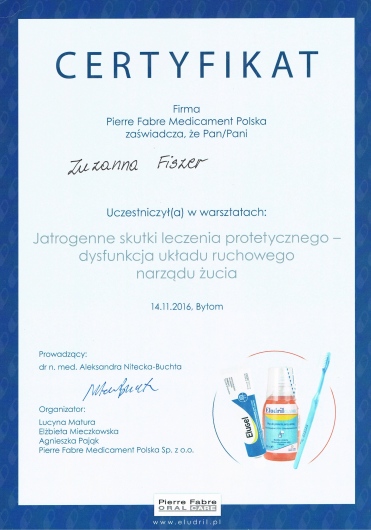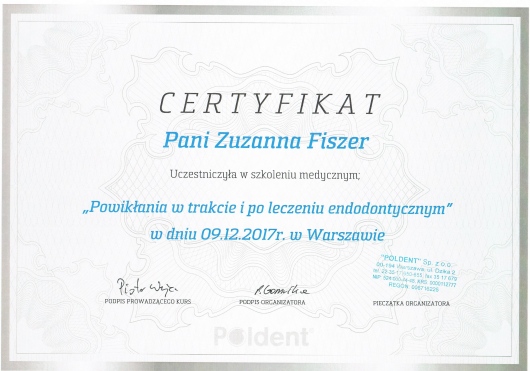 Jaki jest zakres porad oferowanych przez Zuzanna Fiszer?Zuzanna Fiszer to stomatolog. Na podstawie swojego doświadczenia i wykształcenia Zuzanna Fiszer oferuje usługi takie jak: konsultacja protetyczna, wypełnienie kompozytowe, badania stomatologiczne, usuwanie kamienia nazębnego, leczenie kanałowe, odbudowa zębów, rentgen cyfrowy, fluoryzacja zębów, Wybielanie zębów, znieczulenie miejscowe.