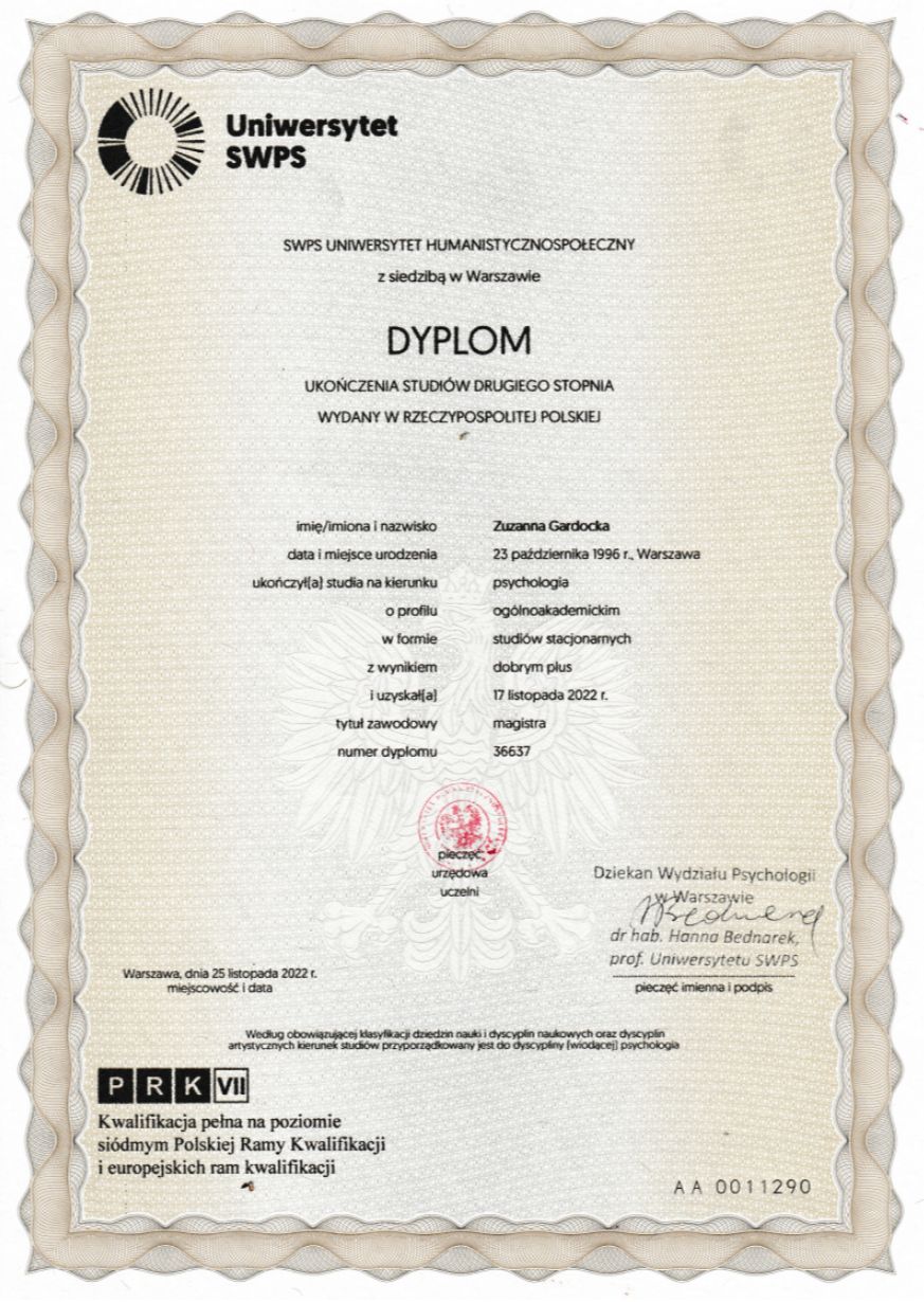 Jaki jest zakres porad oferowanych przez Zuzanna Gardocka?Zuzanna Gardocka to psycholog. Na podstawie swojego doświadczenia i wykształcenia Zuzanna Gardocka oferuje usługi takie jak: Konsultacja psychologiczna, diagnoza ADHD dla dorosłych, Konsultacja psychologiczna online.