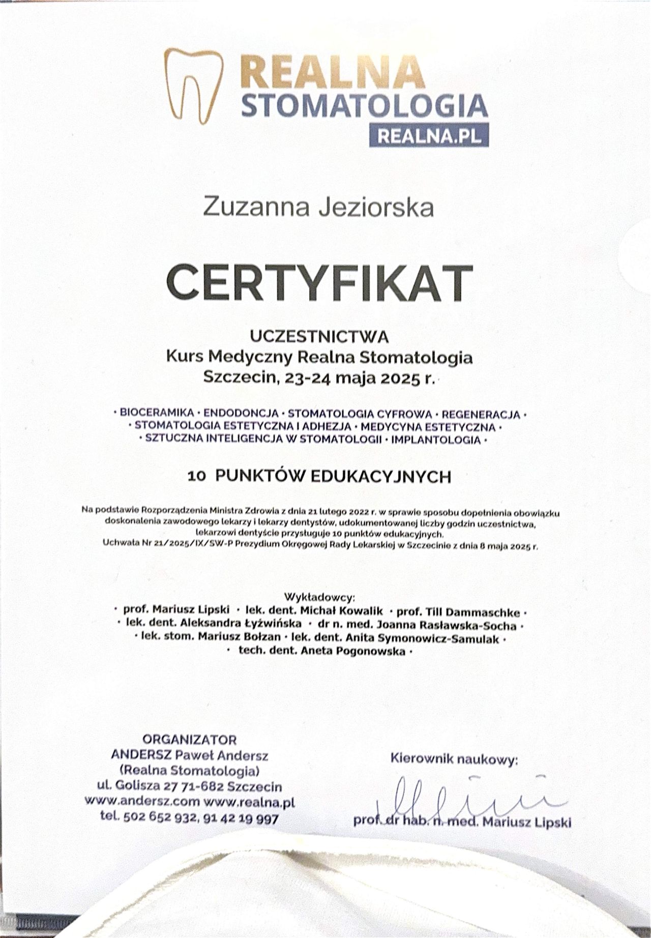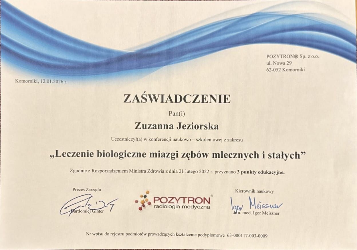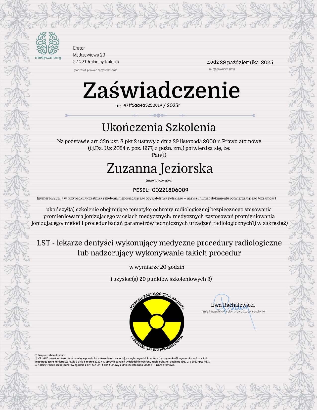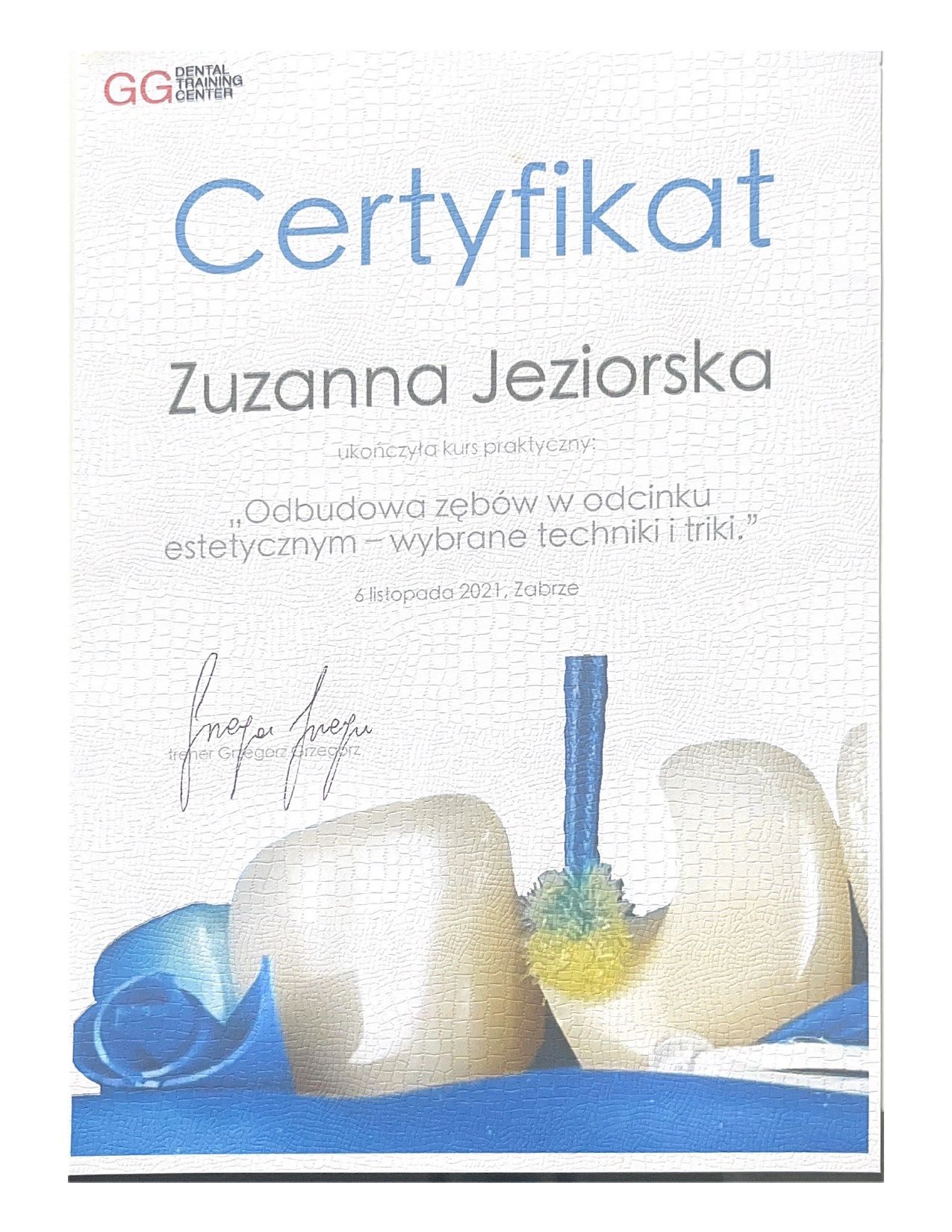 Stawiam na nowoczesne, skuteczne metody leczenia oraz dbałość o estetykę i trwałość efektów. Regularnie poszerzam swoją wiedzę, uczestnicząc w kursach i szkoleniach, by oferować pacjentom moim opiekę stomatologiczną na najwyższym poziomie.