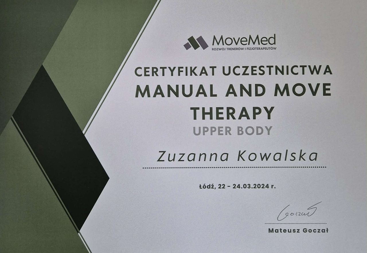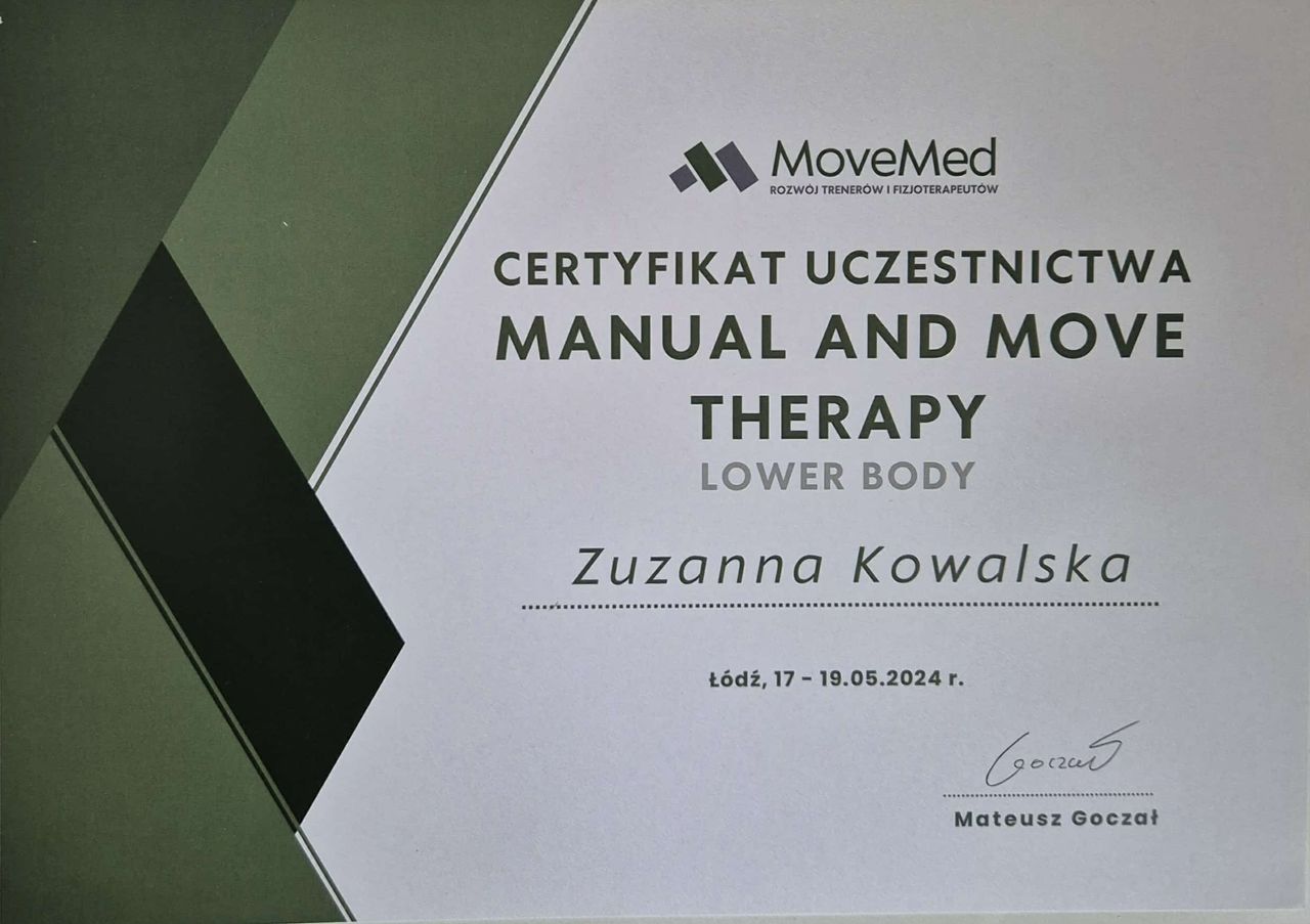 Pani Oleno, bardzo dziękujemy za podzielenie się opinią. Cieszy nas, że zaangażowanie Pani Zuzanny i ćwiczenia podczas wizyty dały odczuwalną poprawę. To motywuje nasz zespół do dalszej pracy z taką samą energią.