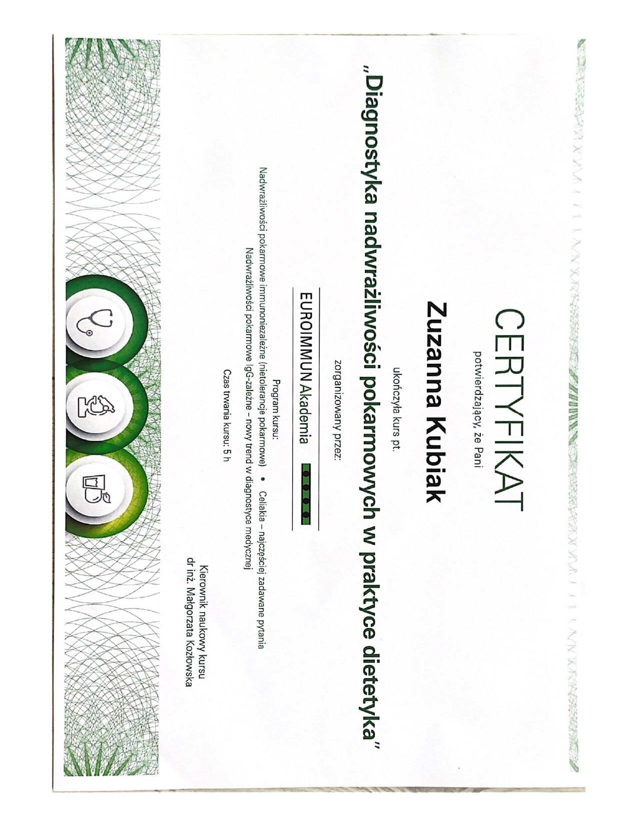 Serdecznie polecam Panią Zuzannę jako wspaniałą dietetyczkę i empatyczną specjalistkę. Obawiałam się wizyty u dietetyka w związku ze strachem przed niezrozumieniem moich potrzeb i problemu zdrowotnego, ale po konsultacji z Panią Zuzanną mam całkowicie inne nastawienie. Pani Zuzanna poświęciła mi dużo czasu i zebrała szczegółowy wywiad, jednocześnie sprawiając, że wizyta przebiegła w przemiłej atmosferze. Podczas rozmowy miałam dużo pytań i na każde dostałam wyczerpującą odpowiedź. Duży plus za holistyczne podejście do zdrowia i wiedzę na temat najnowszych badań naukowych. Dzięki temu mam wrażenie, że mogę wpływać na swoje zdrowie nie rezygnując z przyjemności jedzenia. Szczerze polecam konsultacje z tą specjalistką, ja zamierzam wracać za każdym razem gdy będę potrzebowała pomocy.