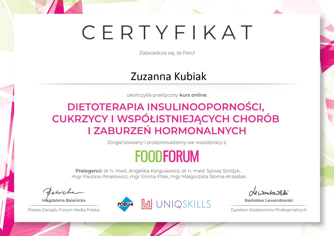 Polecam Panią Zuzannę, dzięki jej poradom dietetycznym oraz zaproponowanym przepisom, które były ciekawe i proste w przygotowaniu udało mi się uniknąć stosowania suplementów diety czy też leków zawierających żelazo, mimo grożącej mi w ciąży anemii. Dzięki jej zaangażowaniu oraz poradom poprawiłyśmy wyniki samą dietą. Ponadto Pani Zuzanna jest bardzo sympatyczną i empatyczną osobą, z którą łatwo nawiązać kontakt. Serdecznie polecam.