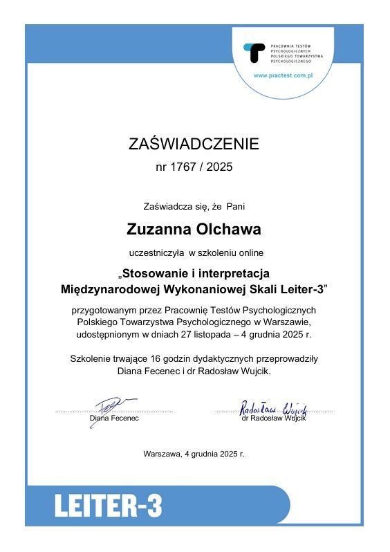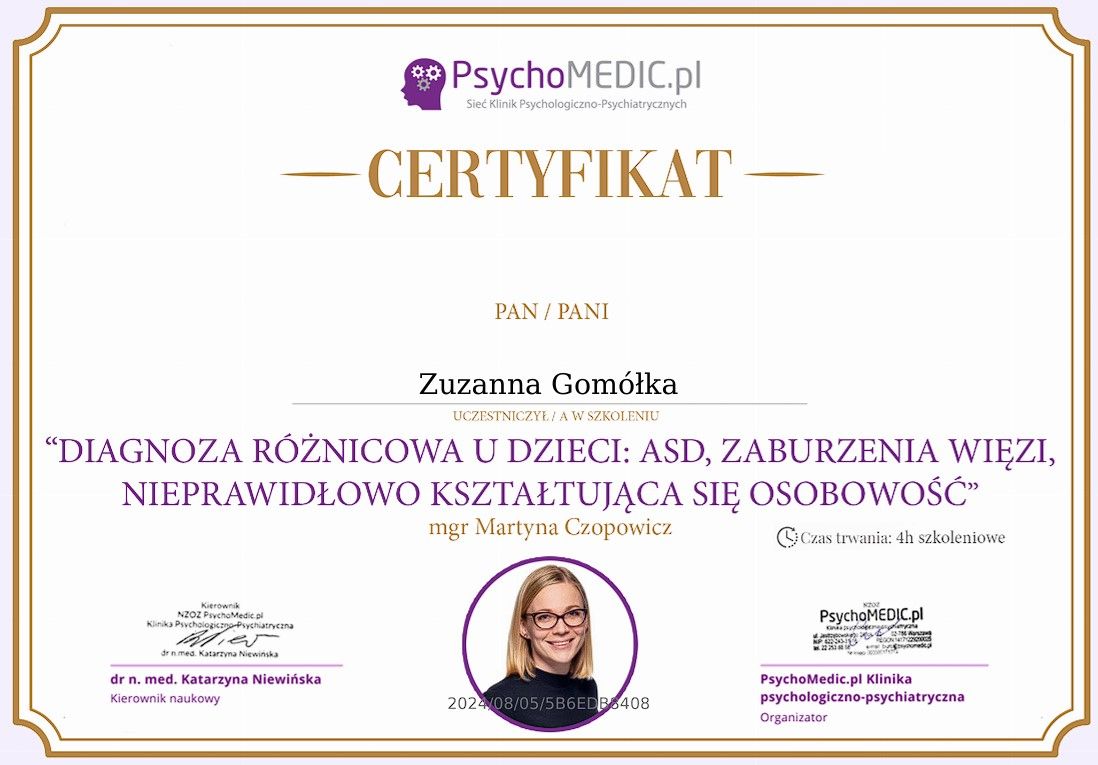 Nieustannie poszerzam wiedzę, uczestnicząc w szkoleniach i kursach dotyczących psychologii dziecięcej, zaburzeń neurorozwojowych, lękowych, tematyki traumy oraz seksuologii rozwojowej. Dzięki temu mogę pracować zgodnie z aktualnymi standardami i stale doskonalić swoje metody.