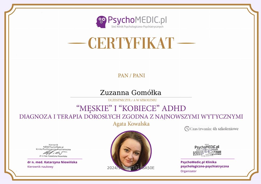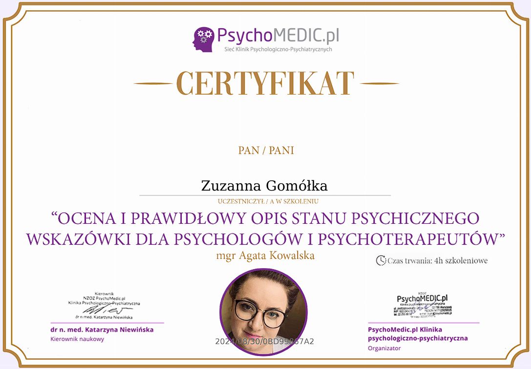 Pani Zuzanna to bardzo empatyczna i wyrozumiała osoba. Wzbudza ogromne zaufanie już po pierwszych minutach rozmowy. Dzięki niej mogłam zwrócić uwagę na kwestie, które wcześniej pomijałam i o których istnieniu wcześniej nie pomyślałam. Polecam