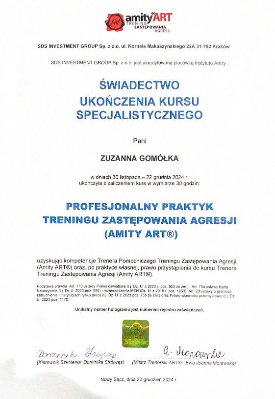 Jestem psychologiem o specjalności klinicznej. Ukończyłam Uniwersytet Komisji Edukacji Narodowej w Krakowie na kierunku psychologia oraz studia podyplomowe nadające uprawnienia pedagogiczne. Posiadam kwalifikacje Trenera Pomocniczego Treningu Zastępowania Agresji (Amity ART) oraz Trenera Bajkoterapii.