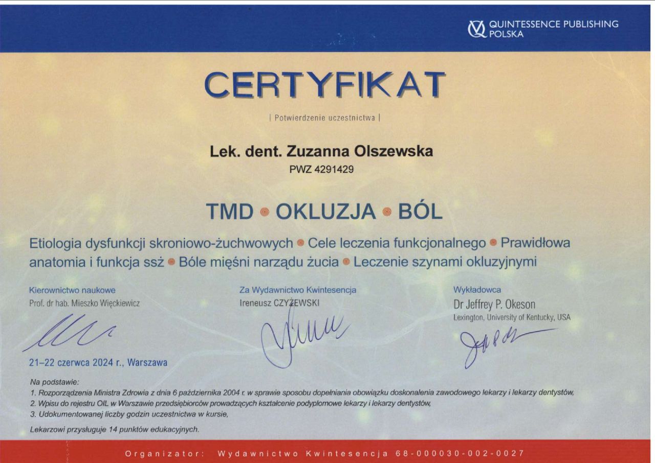 Absolwentka Warszawskiego Uniwersytetu Medycznego. Po ukończeniu stażu rozpoczęła pracę w Poradni Protetyki Stomatologicznej w Mazowieckim Centrum Stomatologii, gdzie zdobywa cenne doświadczenie kliniczne. Specjalizuje się w protetyce stomatologicznej, chirurgii oraz stomatologii zachowawczej. Zajmuje się leczeniem i rehabilitacją uzębienia, oferując pacjentom kompleksową opiekę, dopasowaną do ich indywidualnych potrzeb. Każdy zabieg wykonuje z pełnym zaangażowaniem i troską o komfort oraz zdrowie swoich pacjentów. Nieustannie poszerzę swoją wiedzę biorąc udział w kursach i szkoleniach, aby zapewniać pacjentom usługi na najwyższym poziomie.