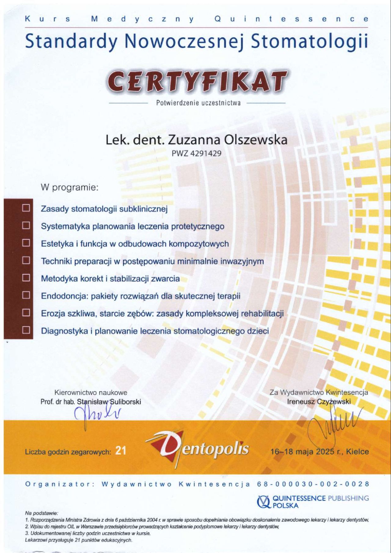 Jesteś już po wizycie u lek. dent. Zuzanna Olszewska? Daj znać, co myślisz. Inni pacjenci będą wdzięczni za pomoc w wyborze najlepszego specjalisty.