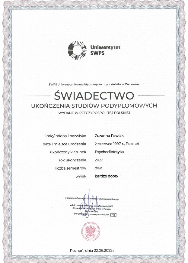 Jestem psycholożką, psychoterapeutką w trakcie szkolenia w nurcie Gestalt oraz psychodietetyczką.