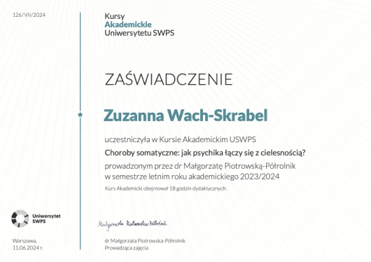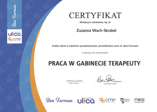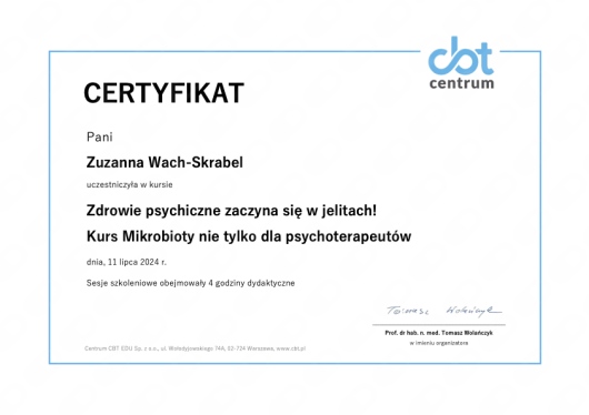 Psycholog w trakcie 4-letniego akredytowanego szkolenia z zakresu psychoterapii poznawczo-behawioralnej akredytowanego przez Polskie Towarzystwo Terapii Poznawczej i Behawioralnej (PTTPB) oraz European Association for Behavioural and Cognitive Psychotherapies (EABCP).